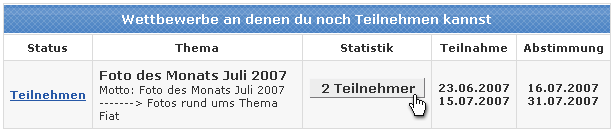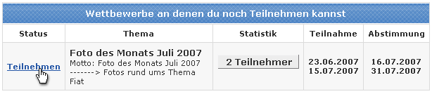 Hier findet Ihr dann eine Aufstellung der Wettbewerbe an denen aktuell eine Teilnahme möglich ist. Um an einem teilzunehmen, einfach auf "Teilnehmen" klicken!