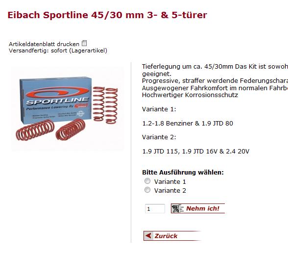 und dann das Eibach Sportline 45/30 mm (am besten hier, oder? -> http://www.fiat-sportiva.de/product_info…---5-t-rer.html - wäre es möglich durchs forum noch rabatt zu bekommen?)